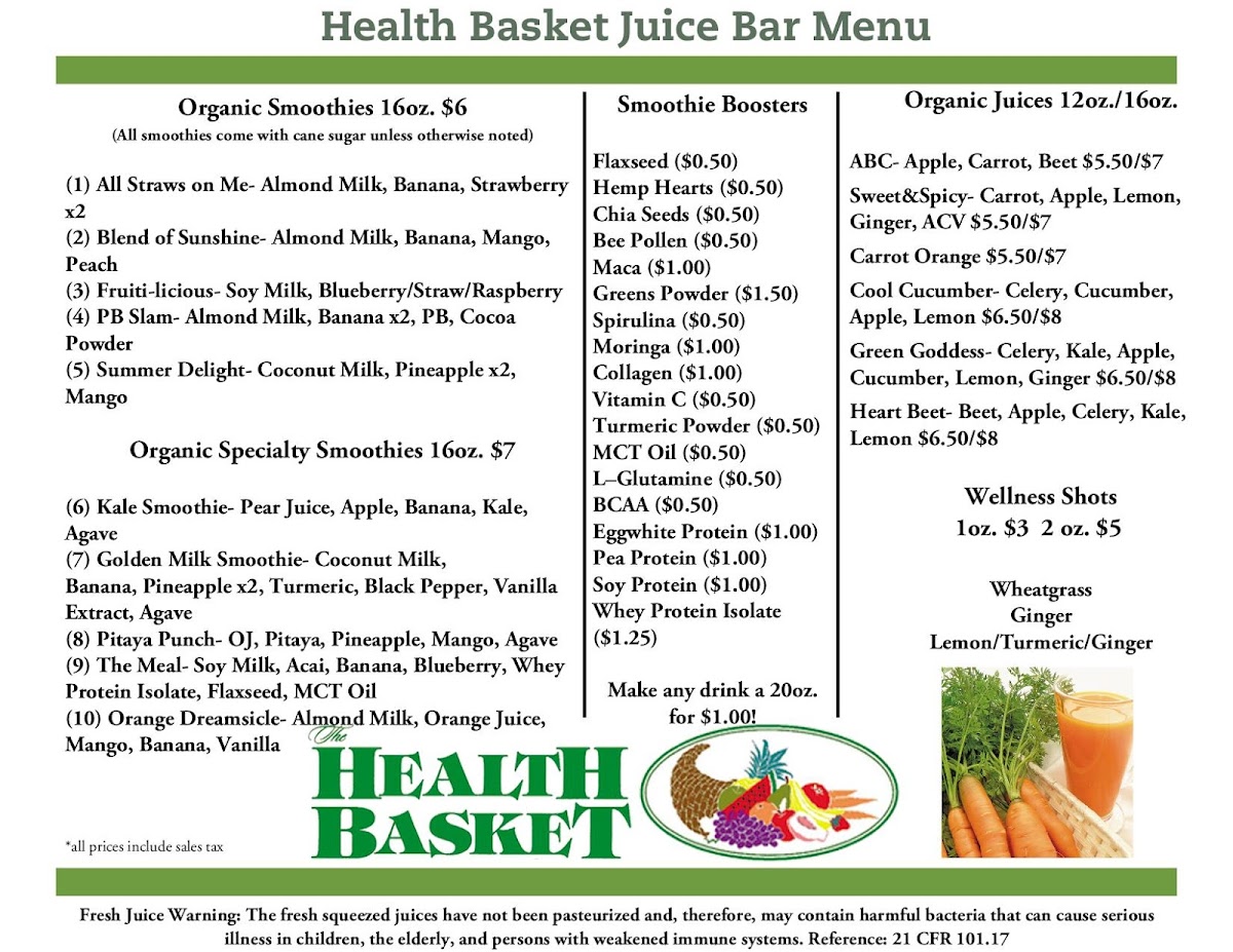 The Health Basket offers a thoughtfully curated menu that feels both accessible and nourishing, blending wholesome ingredients into simple, satisfying options. Whether you’re stopping in for a quick, refreshing juice or picking up ingredients for a healthy meal at home, the menu encourages mindful choices that complement the store’s calm and inviting atmosphere.